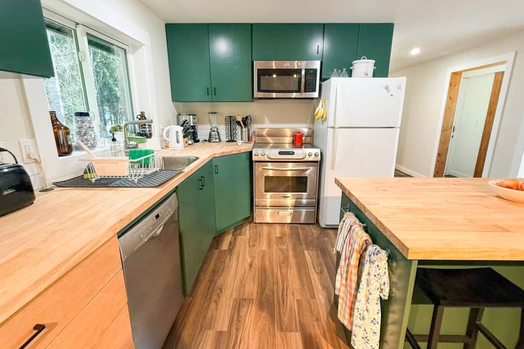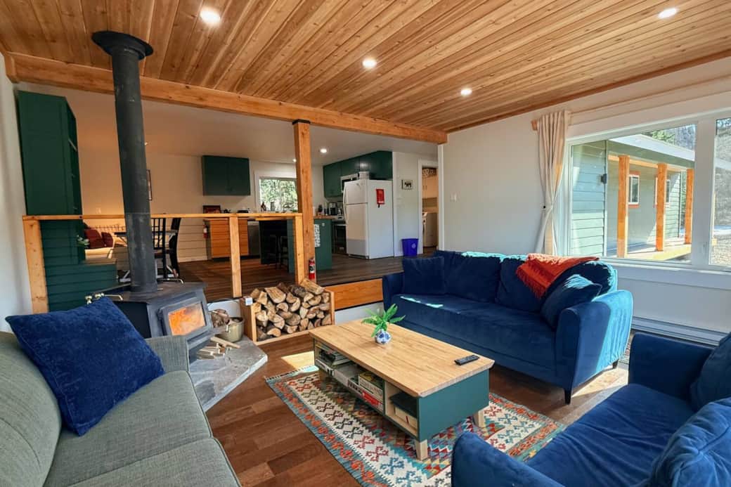 It has a large living space and kitchen with a wood stove as the primary heat source, baseboard heat as secondary. TV is Google Chromecast only.